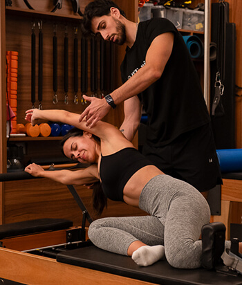 Pilates com equipamentos e clínico para melhoria de postura, flexibilidade, força e tonificação. Treino inteligente para lesões.